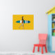 A poster of a surf girl in a red swimsuit with a longboard and a beach clean bag