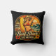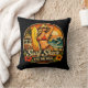 This retro inspired design captures vintage California surf shack energy with a blonde pin-up surfer clutching her surfboard, waves crashing onto the beach, with an antique van in the background. The ride the wave motto, paired with tropical hibiscus flowers complete the salty coastal sunset scene. This beachin' black throw pillow will make a fun addition to your beach house decor. | Matching throw blanket available in store.