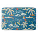 Surf tropical island themed graphics on an Aegean blue background, seamless repeat pattern