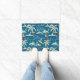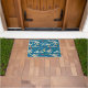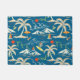 Surf tropical island themed graphics on an Aegean blue background, seamless repeat pattern