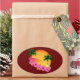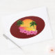 Surfing graphic with surfboard, palm trees, pink hibiscus flowers, and sunset.