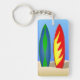 The perfect keychain for a surfer with cool design of two brightly coloured surfboards standing on a beach. These surfboards are retro classic style and reminiscent of a bright Summer, sunny day at the beach. A great design for lovers of the beach and of surfing.