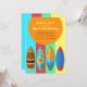 A colourful background and eye-catching surfboard designs make this invitation one you'll want to send and one they want to receive. (FP) <br/><br/>The card is easy to customise with your wording, font, font colour, paper shape options and choice of six paper types.<br/><br/>Not exactly what you're looking for? All our products can be custom designed to meet your needs at no extra charge.<br/><br/>Simply contact us at askpixieprints@aol.com.<br/><br/>Coordinating products available: Just ask us!