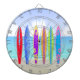 Surfboards Beach Dart Board features a beach background with sand, ocean and sky, 6 colourfully decorated surfboards. Perfect gift for surfer in your life. Includes 6 brass darts (3 American flag dart flights and 3 UK dart flights). Regulation size board (18” diameter, 1” thick). Finished with aluminium frame and hanging hook.