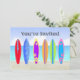 Features a beach background with sand, ocean and sky, 6 colourfully decorated surfboards. Front stylised text is You're Invited. Text is set up on the back for adding your event details. Stylish & trendy Summer Party Invitation is available in two sizes; 5x7 and 5.25x5.25. Add your details to the front and back by simply choosing the "Customise it!" button to begin adding your event details, font style, font size & colour, and wording.