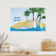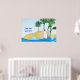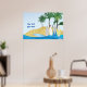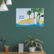 Surfboards on a tropical beach with palm trees poster print, featuring a tropical landscape. There are palm trees and surfboards on the sand and blue waves. It is a template and you can add your text or customise it to change image, text, font, colour. Colour scheme: Blue, green, white, yellow, tan