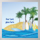 Surfboards on a tropical beach with palm trees poster print, featuring a tropical landscape. There are palm trees and surfboards on the sand and blue waves. It is a template and you can add your text or customise it to change image, text, font, colour. Colour scheme: Blue, green, white, yellow, tan