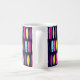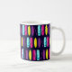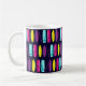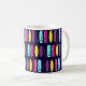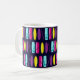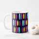 Fun surfboard patterned mug. Featuring rows of brightly coloured surfboards on a dark blue background.