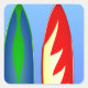 with cool design of two brightly coloured surfboards standing on a beach. These surfboards are retro classic style and reminiscent of a bright Summer, sunny day at the beach. A great design for lovers of the beach and of surfing.