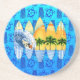 Mural style surfing art on surfboards side by side With a blue background and pink Hawaiian Honu Sea Turtles and Tiki Masks.