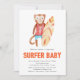 Cute baby shower invitations featuring a painted watercolor monkey holding a surf board with "Surfer Baby" in bold orange typography. Personalise the surfer theme baby shower invitations by adding the mother's name and shower details.