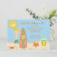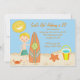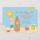 Start your celebration off right with this adorable beach scene invite. Whether it's a party on the beach or just a beach theme it's perfect for you. There's sand along the bottom with a bucket and shovel in it. There's a bright yellow sun in the top corner with a smiley face. A boy standing holding up her surf board. Check out our many other designs and products in this line.© JW Illustrations