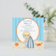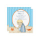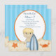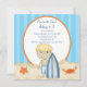 Summer Birthday??? Yeah!! Start your celebration off right with this adorable beach scene invite. Whether it's a party on the beach or just a beach theme it's perfect for you. There's sand along the bottom with an orange crab and starfish in it. A boy with blonde hair is standing in the sand holding a dark and light blue striped surf board. There's a large white oval in the centre outlined in orange. There's a blue background with darker blue stripes. Check out our many other designs and products in this line.