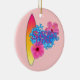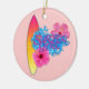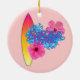 Surfer girl with water splash graphic, surf board, and digitally painted hibiscus flowers.