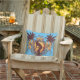This festive outdoor pillow features a silhouette of a woman riding a surfboard surrounded by palm trees and tropical flowers"