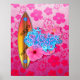 Surfer girl design with water splashes, retro style surfboard with Hawaiian Honu turtles, and pink hibiscus flowers. Pink Hawaiian pattern background of Honu turtles and hibiscus flowers.