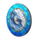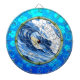 Digital painting of a surfer surfing the tube in a round bamboo frame. With a ocean blue background with Hawaiian Honu Sea Turtles and Hibiscus flowers.
