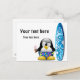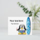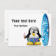 Cute penguin wearing swimwear and holding an icecream and a blue surfing board with flower pattern.