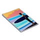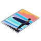 Notebook in a surfer standing on the beach, silhouetted against a semi-abstract background of water and a sunset sky