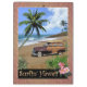 Beautiful retro style design, showing an oldtimer car with surfboard on the beach.