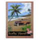 Beautiful retro-style picture, showing an oldtimer car with surfboard on top at the beach, surrounded by tropical vegetation. Text "Surfin' Hawaii" .