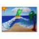 (The painting is of a green angel on an orange surfboard catching a wave. A sun glows in the background and palm tree gently sways on the beach. The wave is getting ready to crash on the beach smoothing the sandy surface. The green angel pays tribute to the Archangel Raphael whose colour is green and is known for bringing healing. The sun helps sustain life and through it plants such as palm trees strengthen and grow. The power of sun's energy is symbolised in the matched orange- yellow surfboard. The beach is clean and smooth. This painting was inspired by the "Wipe Out Cancer Angel". Instead of adding text of this painting, it was left open so you can your own wipe out, riding the wave, or other go with flow message to the beach, cloud, or sky.