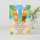 Cute invitation surfboard surfing theme for boy or girl's birthday featuring surfs, beach and blue ocean, and some tropical party equipment.
