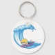 A surfing boy riding his board on a big wave. This design looks really effective on these Keychain