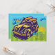 A retro design featuring a buggy with two surfboards on the roof. The background image graduates from green to blue and has butterflies, sun rays, flowers and a plane.