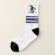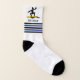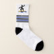 Surfing gifts, surfer his surfboard and black and blue stripes socks with name that showcases a minimalist black icon of a surfer standing up on his yellow surfboard over a blue wave, blue and black stripes and your name.