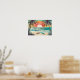 Retro poster print of surfboards in the beach with the sun setting in the background. Generative Content