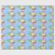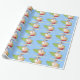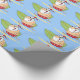 The design on this Christmas wrapping paper is a repeating image of a happy cartoon Santa Claus carrying a surfboard.