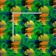 Hawaiian pattern of a surfer silhouette in front of a tropical sunset.