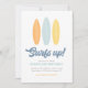 Invite friends and family to celebrate your little one's birthday with this invitation, featuring watercolor surfboards and a pattern of watercolor waves on the back.
