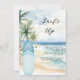 An invitation for a summer beach party. A watercolored sandy beach, ocean waves and palm trees as background, and a blue surfboard on the beach.