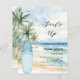 An invitation for a beach birthday party for a boy. A watercolored sandy beach, ocean waves and palm trees as background, and a blue surfboard on the beach.
