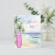An invitation for a beach birthday party for a girl. A watercolored sandy beach, ocean waves and palm trees as background, and a pink surfboard on the beach.