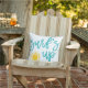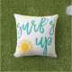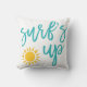 Spruce up your beach house, patio or pool area with our summery outdoor throw pillow! Cute quote design features "surf's up" in vibrant tropical teal handwritten style typography with a bright yellow sun illustration. Pillow reverses to turquoise and white stripes.