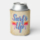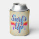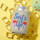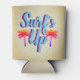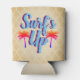 Drink can cooler with a beachy sunset palm trees design and the phrase "Surf's Up".