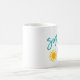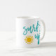 Surf's up! Celebrate summer with our cute quote mug featuring "surf's up" in vibrant turquoise teal handwritten style typography with a bright yellow sun illustration.
