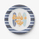Surf's Up! surfboards beach birthday plates in navy blue and light blue and orange.