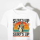 Here’s another trending vintage-style t-shirt design featuring a retro beach scene with a surfer, a faded sunset, and the phrase "Surf’s Up." 🌊🌞