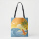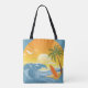 Round design of a beach scene with a small island sporting a palm tree and surf board rising from the sand, surrounded by blue waves under the setting sun. This tote bag is fully customisable.