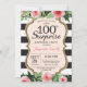 Surprise 100th Birthday Invitation for women. Black and Gold Birthday Party Invite. Gold Glitter. Pink Watercolor Floral Flower. Black and White Stripes. Printable Digital. For further customisation, please click the "Customise it" button and use our design tool to modify this template.