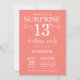 Surprise 13th Birthday Invitation with Coral Background. Kids Birthday. Boy or Girl Bday Invite. 13th 15th 16th 18th 20th 21st 30th 40th 50th 60th 70th 80th 90th 100th, Any age. For further customisation, please click the "Customise it" button and use our design tool to modify this template.