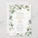 This exquisite, watercolor eucalyptus with gold leaf embellishments and gold splattered dots surprise 50th birthday party invitation is perfect for celebrating your wife, mum, sister, aunt, friend, grandmother. It's soft flowy design is modern yet traditional. Select Personalise this template to make it uniquely your own. In seconds you will see your stunning 50th birthday party invitations.