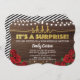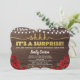 Elegant red rose and gold surprise party invitation with string light design on rustic wood background. Classy, feminine and glamourous.