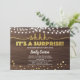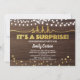 Elegant gold surprise party invitation with string light design on rustic wood background with a classy touch.