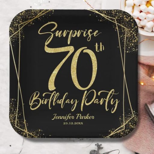 Add a dash of magic to your birthday celebration with our 'Surprise 70th Birthday Party Black & Gold Glitter Napkins !' Shop today and set the tone for a special party!✨🎉 Please note: The gold glitter effect is simulated, no real glitter is used