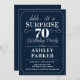 Simple classy design in navy blue and white. Features elegant script font. Surprise bday celebration for man or woman. Can be customized into any age!